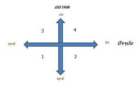 • ช่องเลข 1 ซึ่งเป็นช่องที่เราเลือกการกระทำของเราที่เป็นทุกข์ทั้งในปัจจุบัน และเป็นทุกข์ทั้งในอนาคตด้วย แสดงว่าถ้าเราเลือการกระทำในช่องนี้ สิ่งที่จะเกิดขึ้นก็คือ เราจะไม่มีความสุขทั้งในปัจจุบันและอนาคตการกระทำดังกล่าวก็เช่น การวิตกกังวลในสิ่งที่ตนเองไม่รู้ การคิดไปเองต่างๆ นานา ว่าจะเกิดสิ่งที่ไม่ดีขึ้นกับตนเอง ถ้าทุกวันเรามัวแต่คิดแบบนี้ ปัจจุบันก็ไม่มีความสุข แถมอนาคตก็ไม่มีความสุขอีก เพราะพรุ่งนี้เราก็จะคิดแบบวันนี้เช่นกันครับ