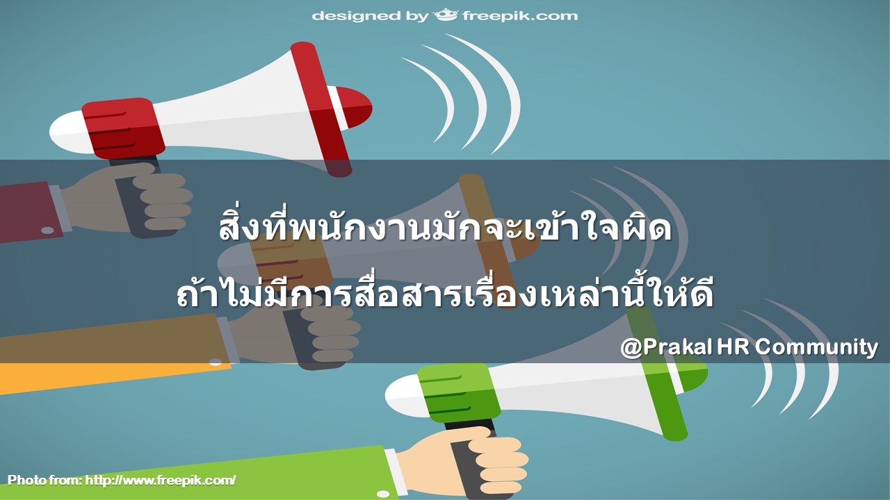ประเด็นเหล่านี้ เป็นประเด็นที่พนักงานมักจะคิดไปเอง เข้าใจไปเอง จริงๆ ก็ยังมีประเด็นปลีกย่อยอีกพอสมควร แต่หลักๆ ก็มักจะหนีไม่พ้นประเด็นที่ได้กล่าวไปข้างต้น เมื่อเราทราบแบบนี้แล้ว ผู้บริหารและ HR ก็น่าจะมีการวางแผนในการสื่อสาร สื่อความ ทำความเข้าใจ จัดให้มีช่องทางในการสื่อสารเรื่องเหล่านี้ ให้กับพนักงานอย่างสม่ำเสมอ