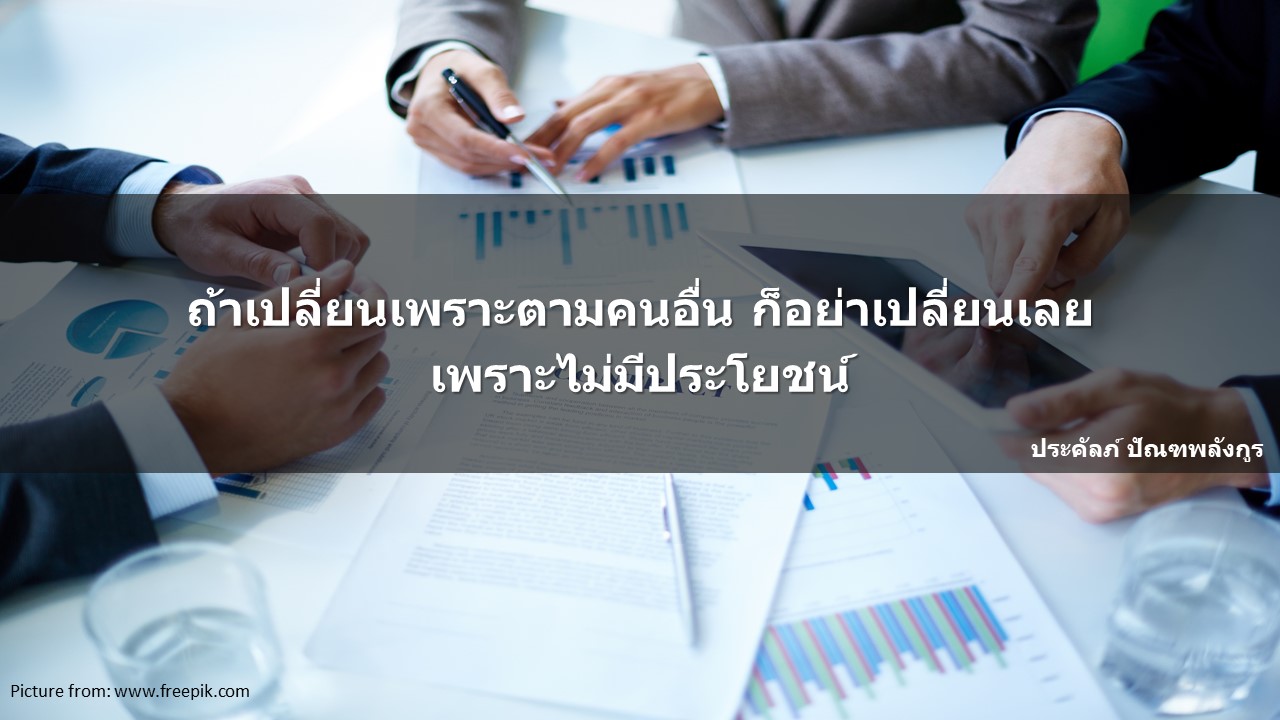 เห็นคนอื่นทำอะไร ก็ทำบ้าง เห็นใครมีระบบอะไรใหม่ๆ ก็อยากมีบ้าง เห็นใครทำอะไรแล้วดี ก็อยากทำบ้าง โดยที่ไม่ได้ศึกษาตัวเองก่อนว่า ตัวเราเอง หรือองค์กรของเรานั้น พร้อมแค่ไหน ที่สำคัญที่สุดก็คือ ผู้ที่คิดจะเปลี่ยนนี่แหละครับ อยากเปลี่ยนจริงๆ หรือแค่คิดว่าคนอื่นยังทำเลย เดี๋ยวเราจะล้าสมัยไม่ทันคนอื่น ถ้าคิดแบบอย่างหลัง ก็อยากจะแนะนำว่า อย่าไปเปลี่ยนแปลงให้เสียเวลาและเสียเงินโดยเปล่าประโยชน์เลยครับ