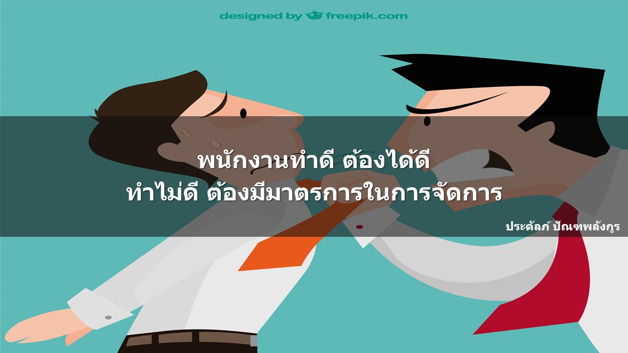 ดังนั้น ผู้บริหาร และผู้จัดการที่ดี จะต้องมีภาวะผู้นำที่สูง จะต้องมีหลักยึดที่ถูกต้อง เวลาพนักงานทำดี มีพฤติกรรมที่ดีก็ต้องชม ต้องส่งเสริม ในทางตรงกันข้าม ถ้าพนักงานทำผิด รวมถึงแสดงพฤติกรรมแย่ๆ ให้เห็น (ซึ่งหลักฐานชัดเจนว่าผิดจริงๆ) ผู้บริหารก็จะต้องมีมาตรการในการจัดการ ไม่ว่าจะเป็นการตักเตือน ลงโทษ หรือแม้กระทั่งการให้ออก
