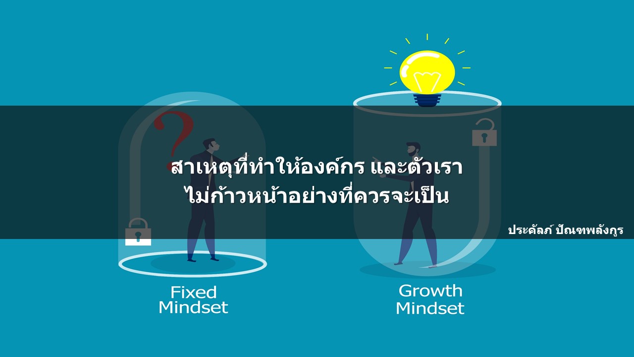- มี Fixed Mindset มากเกินไป สาเหตุที่สอง ที่ทำให้เราและองค์กรไม่ก้าวหน้าไปไหนก็คือ การที่เราเอง หรือผู้บริหารขององค์กรมีความคิดปิดตัวเองมากเกินไป หรือที่เราเรียกกันว่า Fixed Mindset ก็คือ มองทุกอย่างมีข้อจำกัดไปหมด เช่น พนักงานที่ไม่เก่ง ก็จะไม่เก่งตลอดไป หรือมองว่า บางเรื่องเราไม่สามารถพัฒนาได้ หรือ เราทำไม่ได้แน่ๆ ผู้บริหารบางคนมองว่า “พนักงานของเราก็มีความรู้แค่นี้เอง แล้วจะไปเปลี่ยนแปลงอะไรได้” แค่คิดแบบนี้ก็ทำให้เราไม่ก้าวหน้าไปไหนได้แล้ว ดังนั้นถ้าอยากก้าวหน้าไปหยุด เราจะต้องเปลี่ยนเป็น Growth Mindset ก็คือมองว่ามีหนทางไปได้อย่างแน่นอน ทุกอย่างพัฒนาได้ คนของเราเรียนรู้และพัฒนาได้แน่นอน แค่อาจจะช้าเร็วไม่เท่ากัน