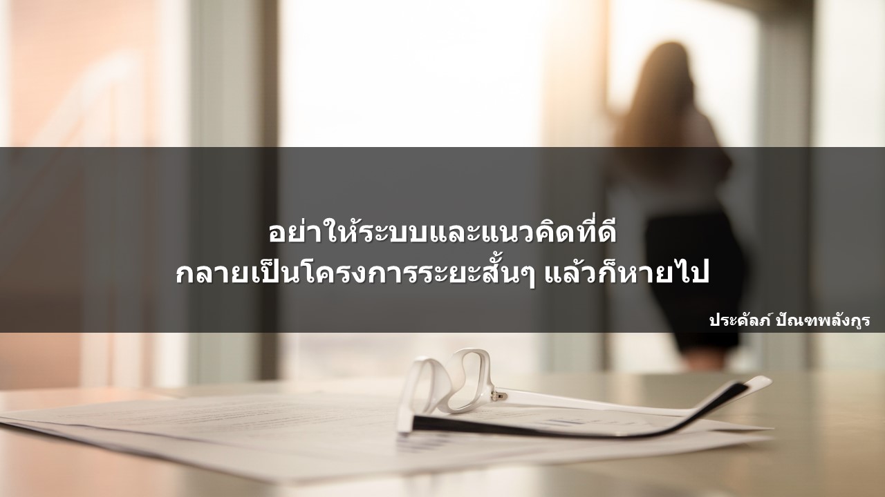 ทั้งนี้ก็เพื่อให้ระบบงานใหม่ที่เราอุตส่าห์คิดแล้วว่า เป็นระบบที่ดี ทำให้องค์กรยั่งยืนได้นั้น มันเกิดผลจริงในทางปฏิบัติ ไม่ใช่แค่เพียงโครงการที่ดูดี ระยะสั้น แค่ได้ชื่อว่าทำระบบใหม่แล้ว แต่ไม่สามารถเอามาใช้งานได้จริง