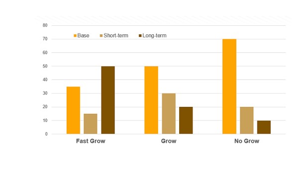 - องค์กรที่เติบโตอย่างรวดเร็วนั้น องค์ประกอบของค่าตอบแทน จะเน้นไปที่เรื่องของ Long-term reward ซึ่งจะเป็นตัวกระตุ้นให้พนักงานอยากสร้างผลงานในระยะยาวให้มากขึ้น โดยที่มีเงินเดือนเป็นตัวรอง และสุดท้ายก็คือ short-term reward เหตุผลก็คือ Long-term reward ที่ให้ในสัดส่วนที่มากกว่าค่าตอบแทนตัวอื่นนั้น จะเป็นตัวกระตุ้นให้พนักงานที่เป็นกลุ่มคนเก่ง สร้างผลงานในระยะยาวให้กับบริษัท และตัวพนักงานเองก็จะได้รางวัลตอบแทนแบบระยะยาวตามความสำเร็จขององค์กร